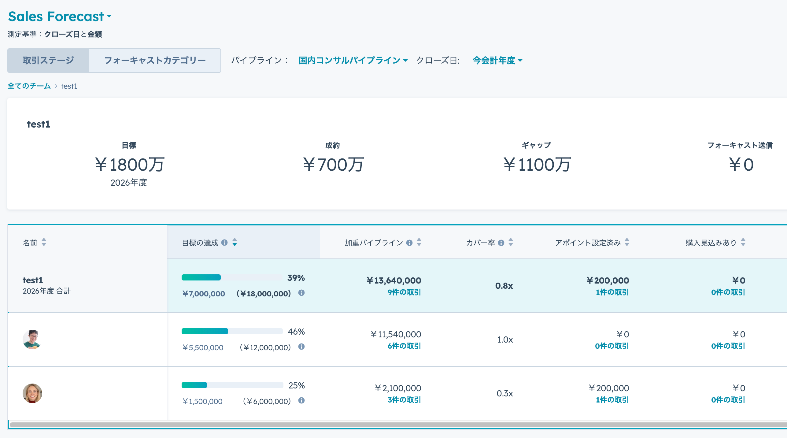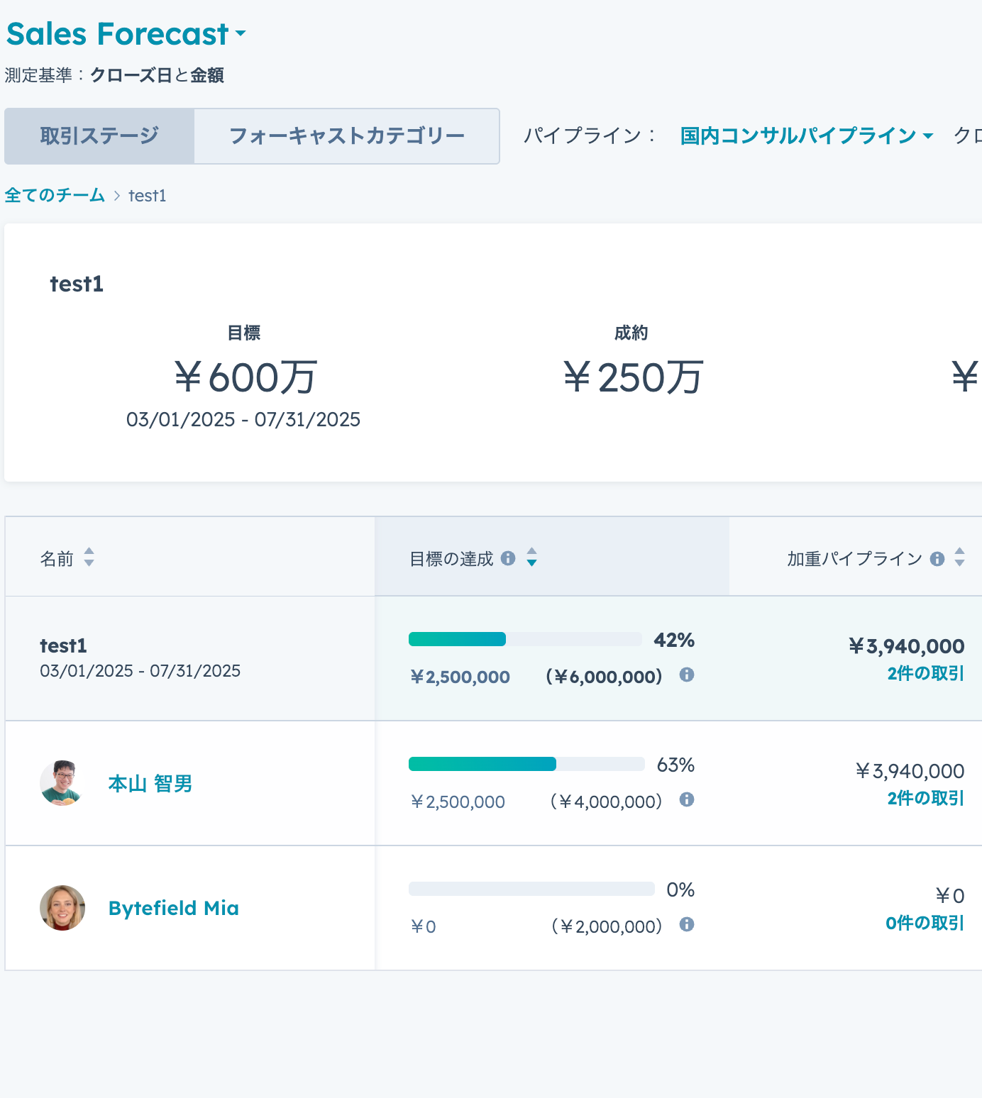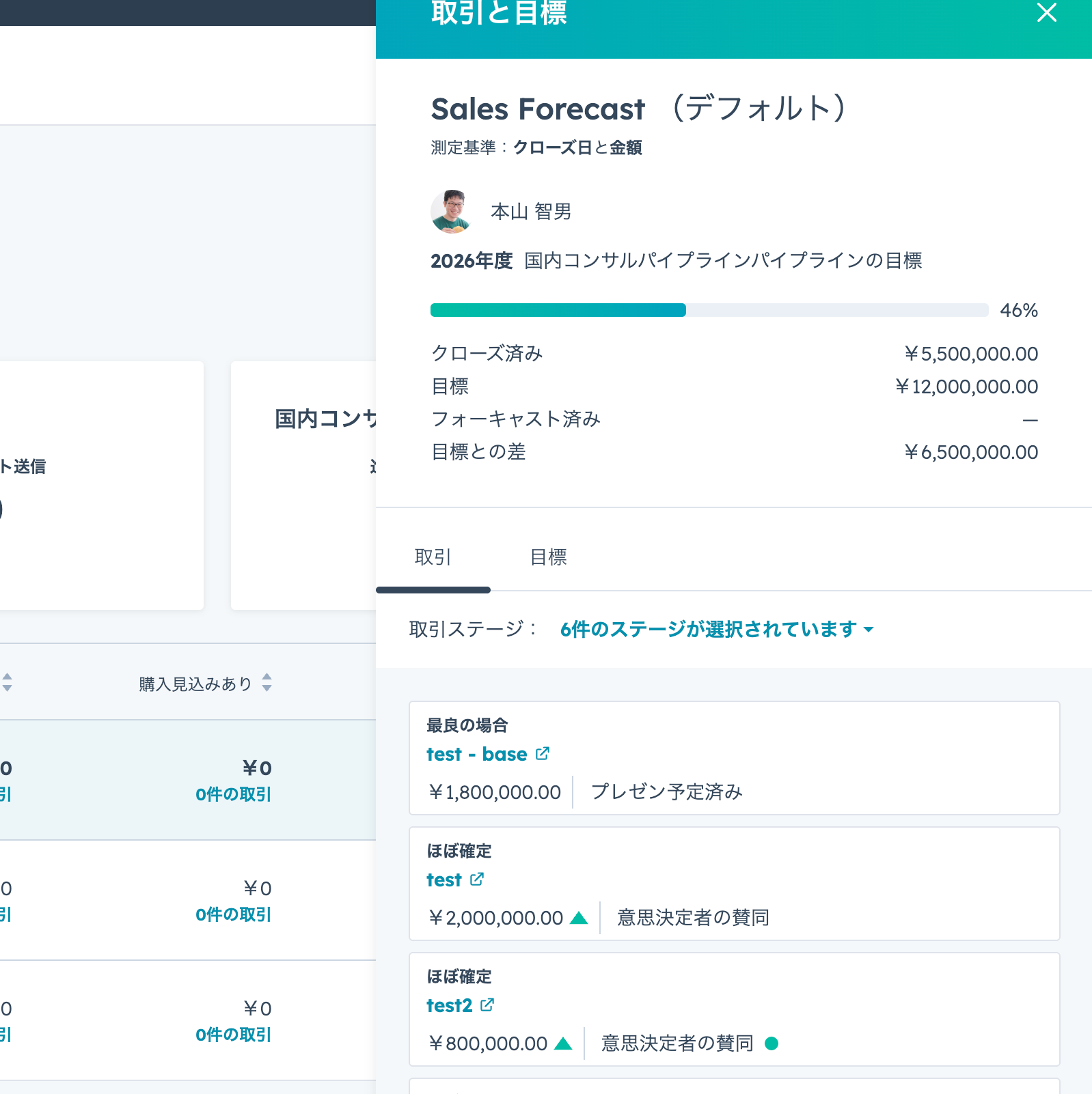 HubSpotの売上予測機能を活用することで、各メンバーやチーム全体の売上目標に対する進捗状況をリアルタイムで確認できます。これは、設定した目標と現在の実績、そして予測される将来の見込みを常に比較検討できることを意味します。